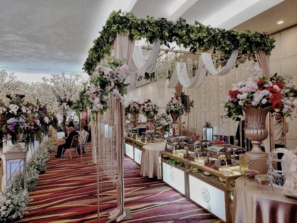 Set Pelaminan dengan Artificial & Fresh Flower, Karpet Artificial Flower 50% & Fresh Flower 50% Taman Pelaminan Standar max 14m Lighting Pelaminan, 1 Janur, 4 Kotak Uang , Karpet Jalan, 2 Meja Penerima Tamu, Gallery Foto, Selfie Area, 4 Buku Tamu + Pulpen Dekorasi Ruang Resepsi, Dekorasi Buffeet, Dekorasi Stall, Dekorasi Meja Pengantin, Dekorasi Meja VIP, Dekorasi Panggung Music, Dekorasi Area Selfie, Dekorasi Galeri Foto Peralatan & Service Catering, 1 Handbouquet, Nasi Punar dan Bakakak